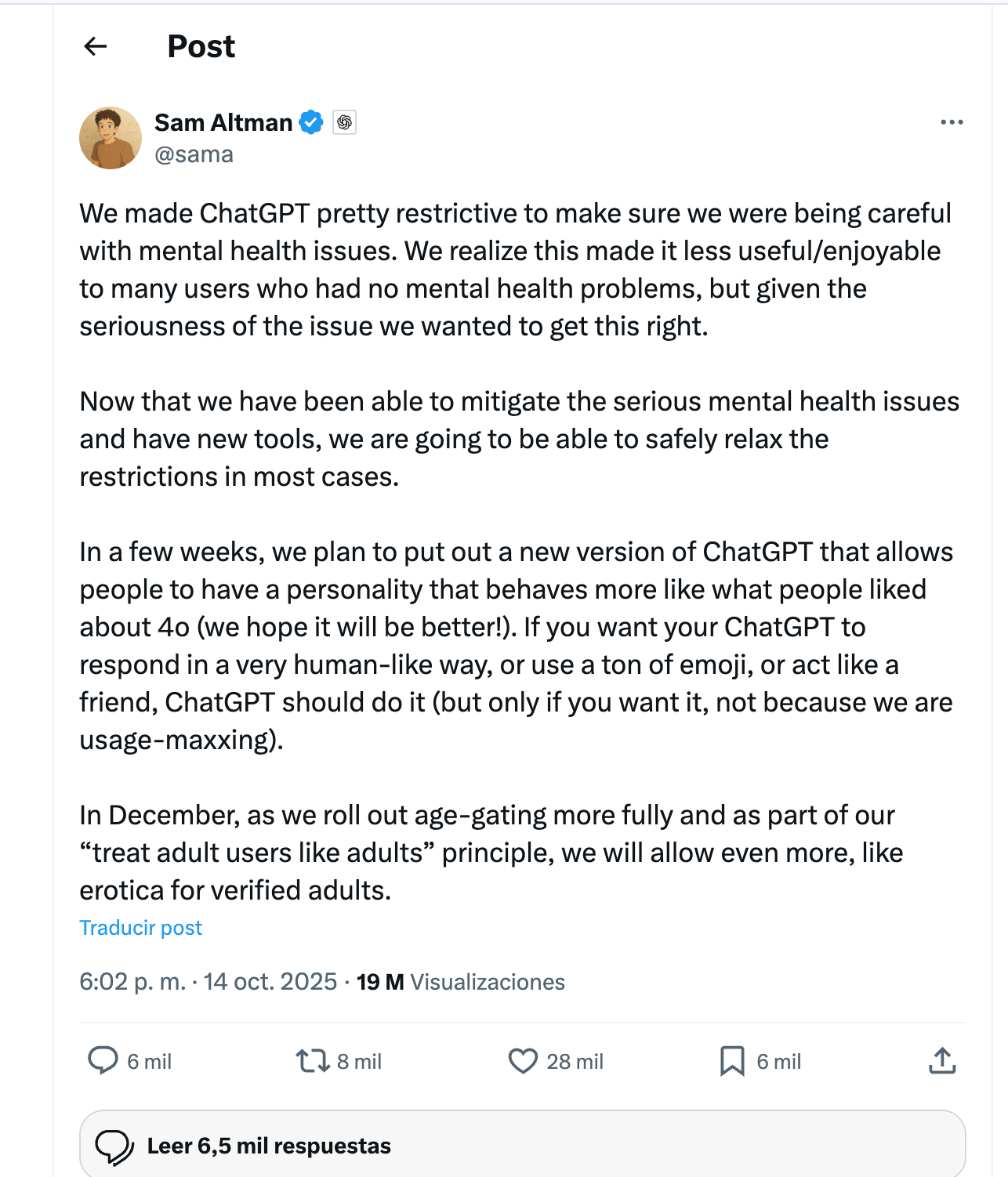 “En diciembre, a medida que implementemos el control de edad de manera más completa y como parte de nuestro principio de “tratar a los usuarios adultos como adultos”, permitiremos aún más, como contenido erótico para adultos verificados.”